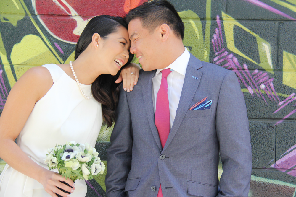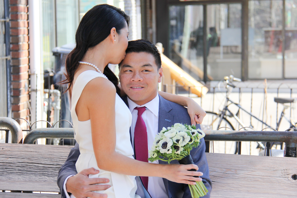 They had a traditional tea ceremony at their home with their family then a small civil ceremony at Toronto City Hall. On our way to City Hall we stopped in Kensington Market to take some photos of the two and after their ceremony we headed to L’ouvier Kitchen Bar for their reception. Christine had put together so many beautiful details – she made each guest favour and place card and added some fun activities for the kids table. And seeing as she’s a florist, she even designed the floral arrangements, including her gorgeous bouquet.
